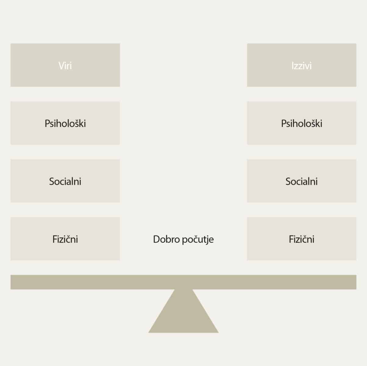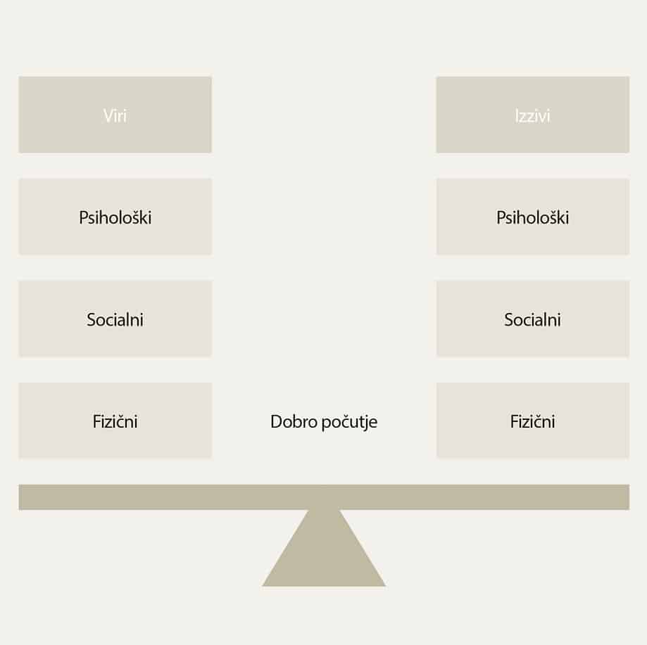 Razumevanje dobrega počutja na delovnem mestu temelji na razumevanju dobrega počutja na splošno. Najbolj primerna razlaga dobrega počutja na delovnem mestu temelji na ravnovesju med viri in izzivi (slika 1). Vsak zaposleni naj bi torej v trenutku, ko pride do izziva in se mu ravnovesje poruši, imel na voljo dovolj virov v psihični, socialni ali fizični obliki, da to ravnovesje znova vzpostavi. Dobro počutje je bistveno, da v situaciji, ko je človek postavljen pred izziv, tega uravnoteži s svojimi viri. Poleg univerzalnosti to definicijo odlikujejo še enostavnost, merljivost in optimistična naravnanost8.