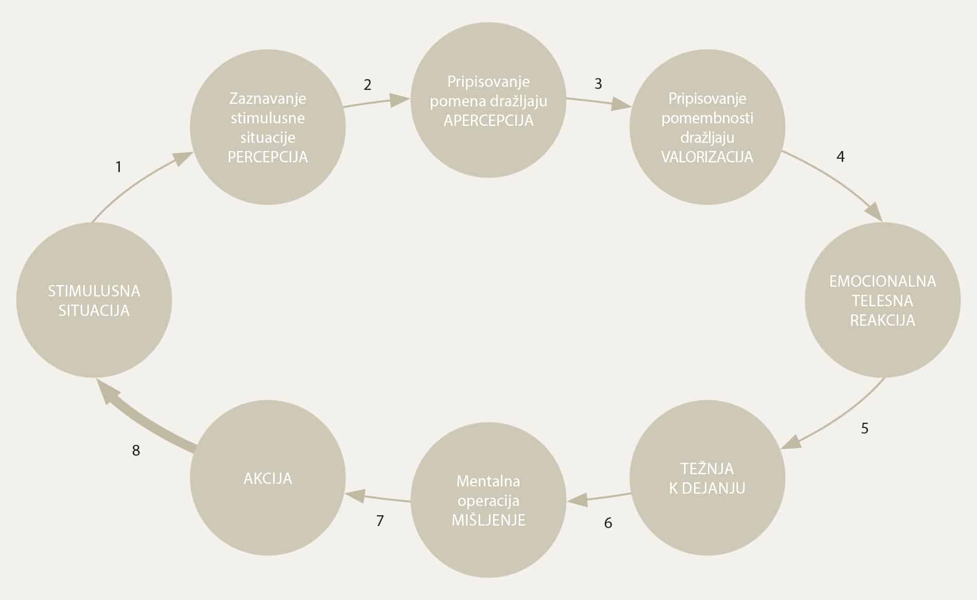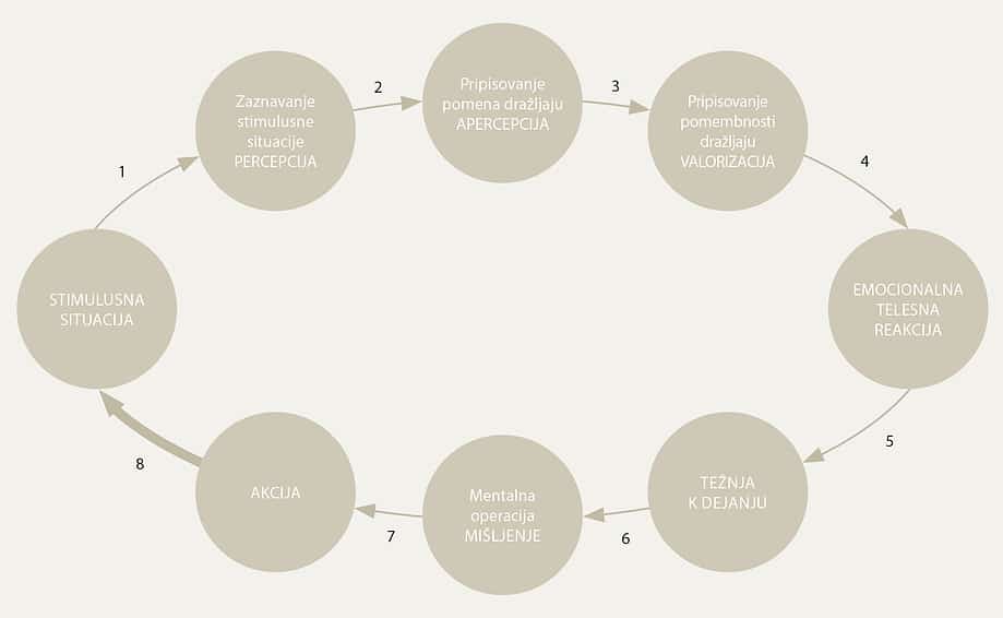 Čustvo je celosten kognitivno-fiziološki-vedenjski odziv človeka v odnosu do sveta. Emocionalna reakcija (Slika 1.) je odgovor na stimulusno situacijo, ki je lahko sprememba v zunanjem svetu (dogodek) ali notranji dražljaj (mentalna predstava preteklega dogodka ali dogodka v prihodnosti). Miselni predstavi stimulusne situacije (percepcija) določimo pomen (apercepcija) in jo ovrednotimo (valorizacija). Percepcija, aparcepocija in valorizacija sestavljajo primarno kognicijo v procesu nastajanja emocije in ni odvisna od dražljaja, kot to velikokrat mislimo, temveč od pomena in pomembnosti, ki mu ga pripišemo. Gre za notranji proces dekodiranja na osnovi našega RO-ja. Ljudje nikoli ne reagiramo neposredno na zunanje okoliščine, ampak na pomen, ki jim jih pripišemo. Tako ima lahko enaka stvar za različne ljudi različen pomen in pomembnost ali pa pomembnosti sploh nima.