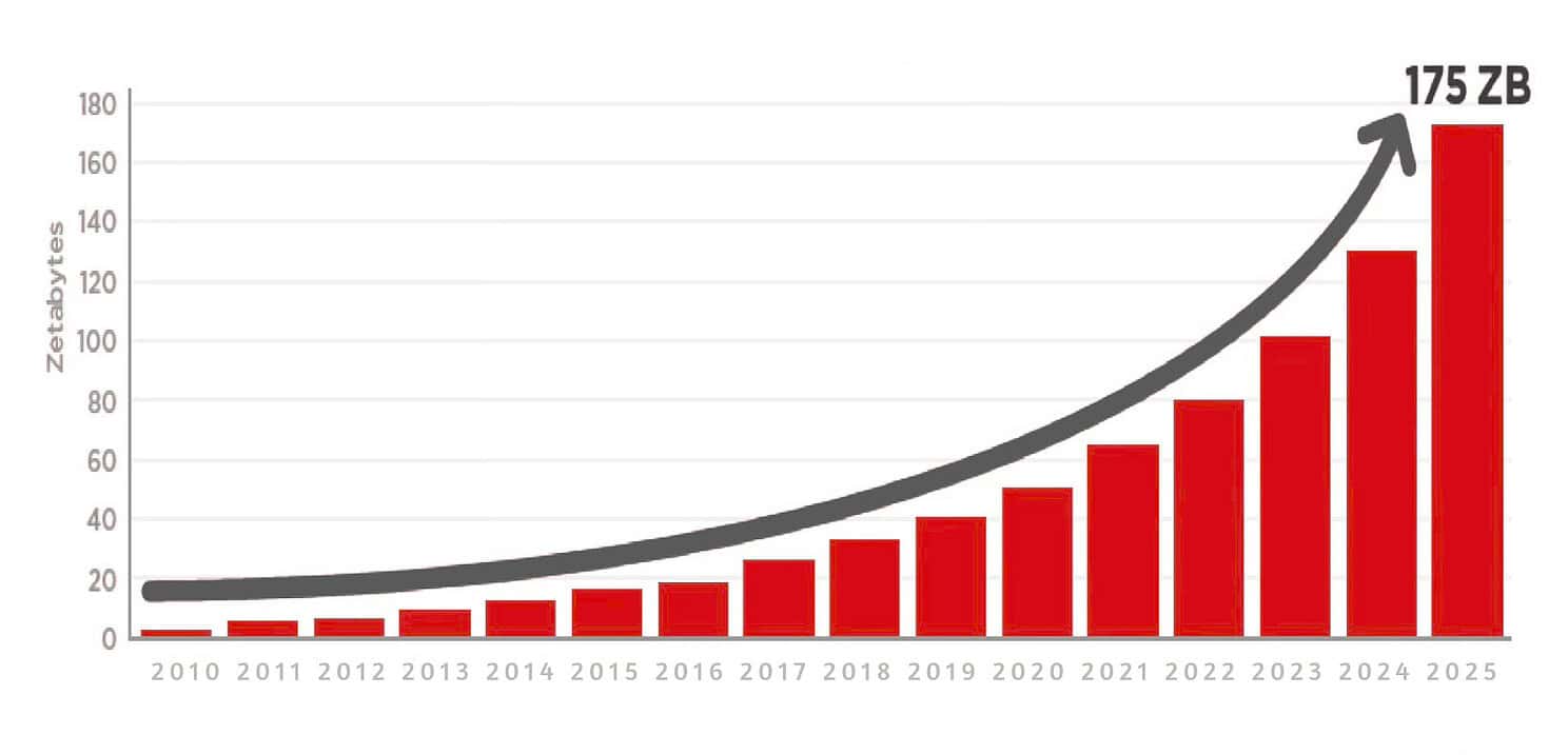 Nastaja paradoks sodobnega poslovanja: podatkov je vedno več, vendar sposobnost njihove smiselne uporabe pogosto ne raste v enakem ritmu. IDC v okviru raziskave Global DataSphere (5) že več let objavlja ocene globalnega obsega podatkov (t. i. DataSphere), pri čemer spremlja količino podatkov, ustvarjenih, zajetih, kopiranih in porabljenih po svetu. Po projekcijah IDC naj bi globalni obseg podatkov zrasel s 33 zettabajtov leta 2018 na približno 175 zettabajtov leta 2025 (1 zettabajt = 1 bilijon (10¹²) gigabajtov). To pomeni, da organizacije, ki ne razvijajo kompetenc za učinkovito upravljanje podatkov, tvegajo, da bodo preplavljene z informacijami, ki jih ne bodo znale smiselno uporabiti za sprejemanje hitrejših in bolj informiranih odločitev.