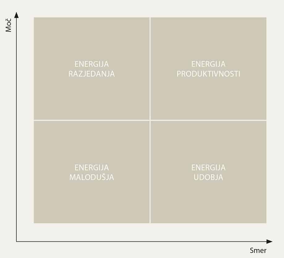 Če na kratko povzamem, je organizacijska energija nekakšna nevidna, a zelo močna sila, ki jo ustvarjamo ljudje s svojim načinom razmišljanja, čustvovanja ter vedenja. Moč organizacijske energije pa se kaže v nivoju čustvenega, umskega in vedenjskega potenciala ljudi in je ključni dejavnik delovne uspešnosti ter tesno povezana z uspehom podjetja. Organizacije se med seboj razlikujejo tako po intenzivnosti kot tudi po kakovosti energije. Kombinacija teh dveh razsežnosti določa razmerje med štirimi naravnimi stanji organizacijske energije, ki je lastno sleherni organizaciji (slika 1).