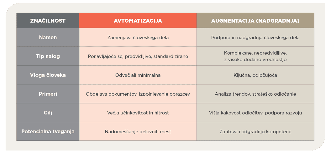 UI ni nevtralna tehnologija, temveč ima potencial za reprogramiranje organizacijske dinamike. V organizacijskem kontekstu to pomeni, da UI lahko prevzame ponavljajoče se procese, analizira velike količine podatkov in nudi podporo pri kompleksnih odločitvah (Agrawal et al., 2019). Po raziskavi Brynjolfssona in sodelavcev (2021) lahko skoraj 20 % zaposlenih avtomatizira več kot polovico svojih nalog z uporabo velikih jezikovnih modelov. Kljub temu pa uvajanje UI sproža temeljni paradoks: ali tehnologija res nadomešča človeka ali pa ga, prav nasprotno, potrebuje za učinkovito delovanje? V praksi se namreč avtomatizirajo predvsem rutinske in standardizirane naloge, kjer UI zanesljivo deluje brez človeškega posredovanja. Kadar pa gre za naloge z visoko stopnjo negotovosti, moralno odgovornostjo ali potrebo po empatiji in kontekstu, se izkaže, da UI ne more delovati samostojno. Tu v ospredje stopa koncept augmentacije, ki pomeni nadgradnjo človeškega dela s tehnologijo, ne pa njegovo zamenjavo (Holzinger, 2016).