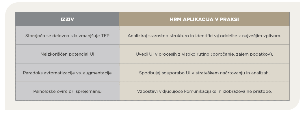 Po ugotovitvah raziskave The Role of Artificial Intelligence in Bridging the Negative Effects of an Aging Workforce on Productivity (Pevcin & Debelak, 2025) lahko že 5-odstotno povečanje deleža zaposlenih v starostni skupini 55–64 let povzroči do 3-odstotni upad TFP-ja. Ta učinek je posebej izrazit v panogah, kjer so tehnološke spremembe pogoste in zahtevajo nenehno prilagajanje. Hkrati se starejši zaposleni pogosto počasneje prilagajajo novim tehnologijam in se redkeje vključujejo v nadaljnje izobraževanje, kar še poglablja razkorak med zahtevami delovnih mest in dejanskimi kompetencami. Vse to se dogaja še v kombinaciji z zmanjševanjem števila mladih na trgu dela, kar dodatno zaostruje izzive na področju človeškega kapitala.
